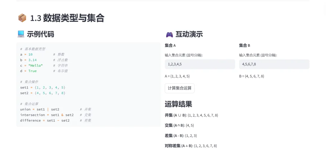 (1)数据类型与集合运算:代码展现了4种基本数据类型:整数(int)、浮点数(float)、字符串(str)、布尔值(bool),集合的创建:使用花括号{}定义集合,3种集合运算:并集(|)、交集(&)、差集(-)。