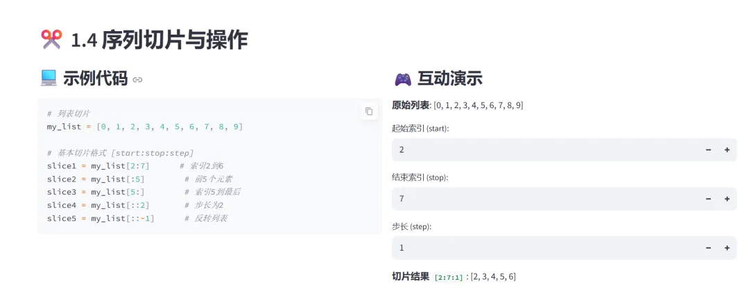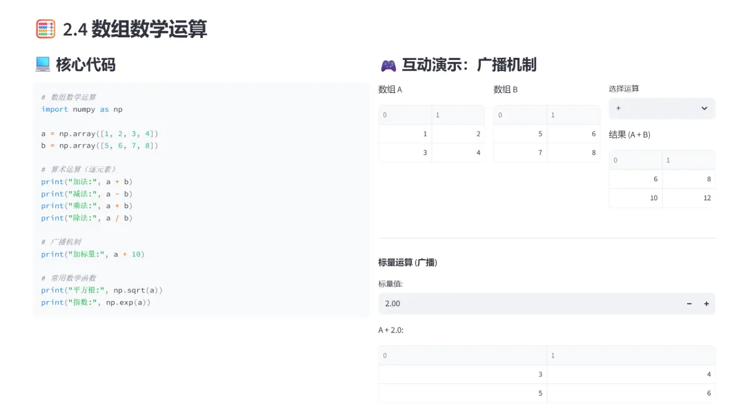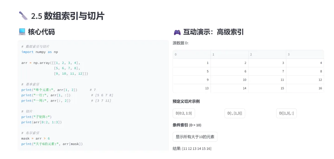 (5)索引与切片:该模块专门讲解NumPy数组的多维索引、切片操作和布尔索引,通过预定义的切片示例和条件筛选,让学习者直观理解NumPy数组的灵活访问方。