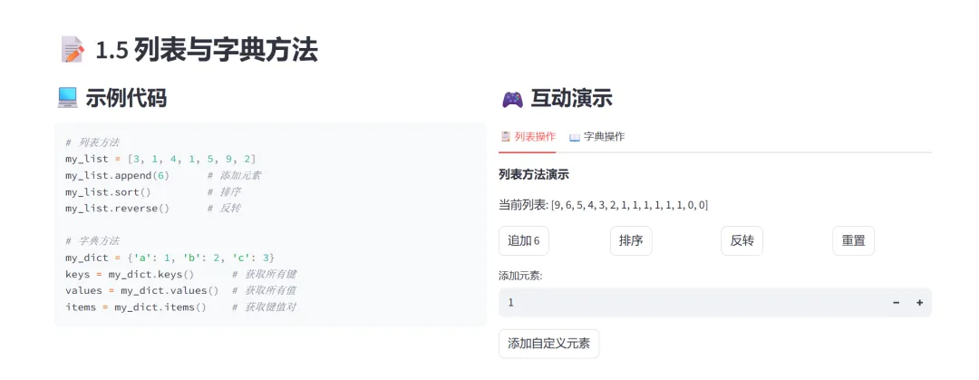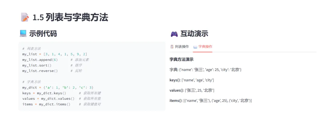 (3)列表与字典方法:列表示例使用包含重复元素的无序列表,展示了append()、sort()、reverse()三个常用方法,字典示例展示了keys()、values()、items()三个视图方法。列表和字典双向选择提供了更多的操作方法和视图方法