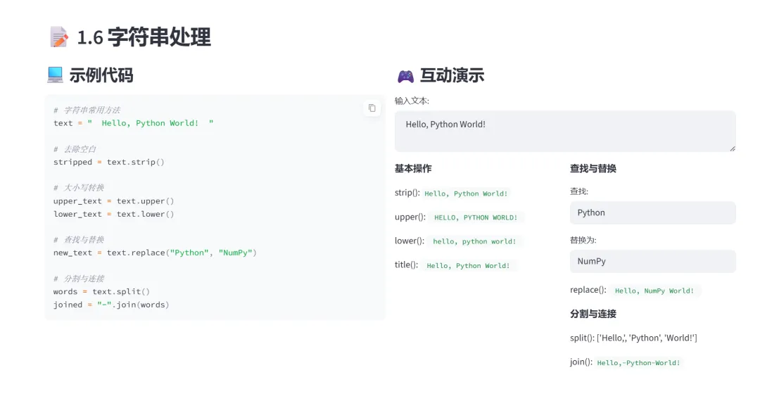 (4)字符串处理:1.无需点击按钮,输入即显示结果2.降低操作门槛,专注于理解方法效果3.鼓励自由探索和尝试。