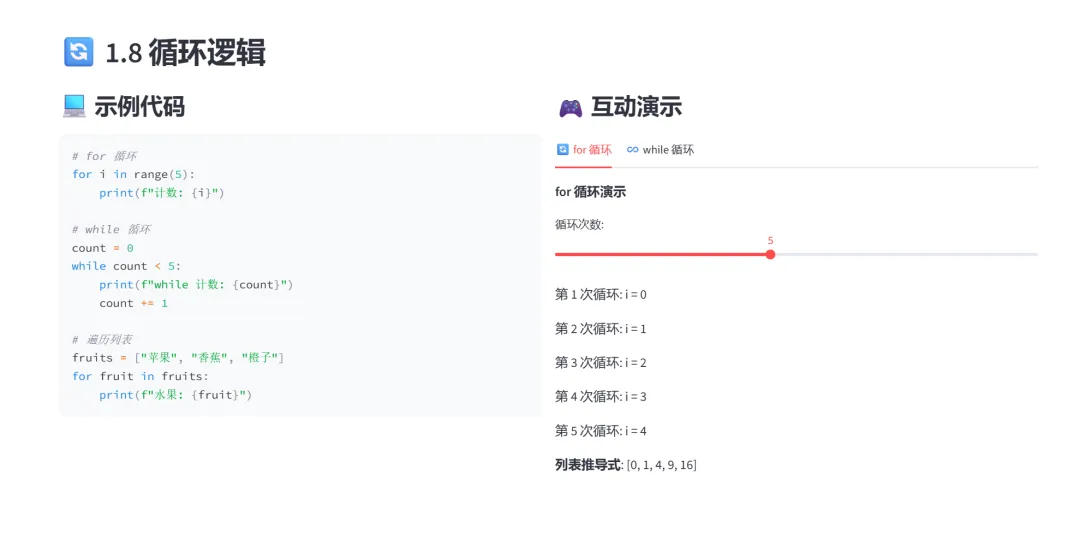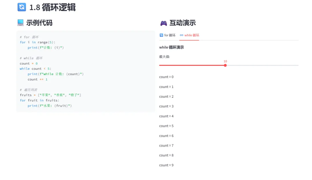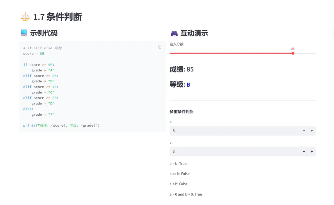 这个项目将七章教学内容整合进一个交互式网页中,左侧选择章节和模块,右侧立即呈现代码和可操作的演示界面。