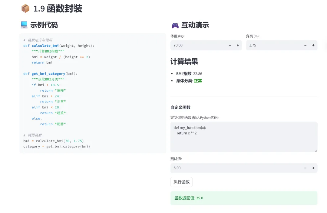 在集合运算模块中,你可以自定义两个集合的元素,系统自动计算并集、交集、差集,在函数封装模块中,内置了一个BMI计算器,输入体重和身高,立即得到BMI指数和身体分类。你还可以自定义函数,实时测试执行结果。