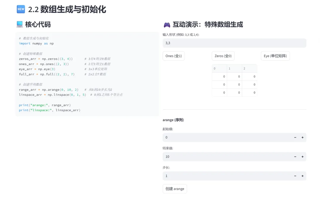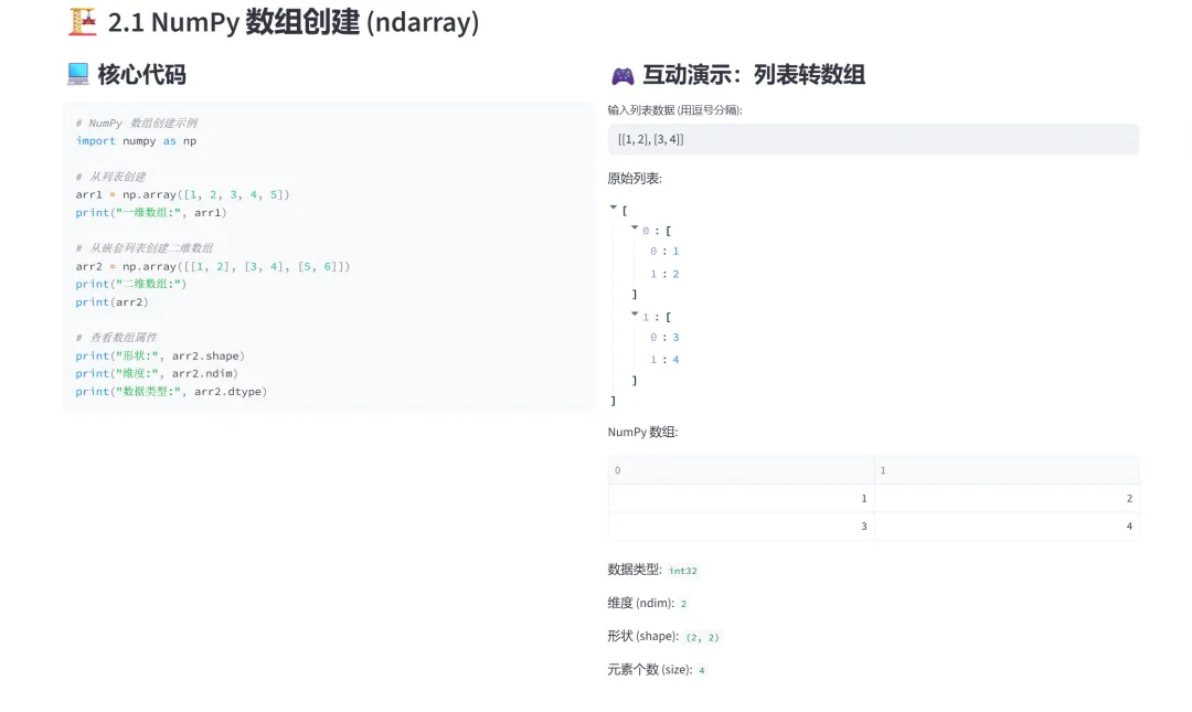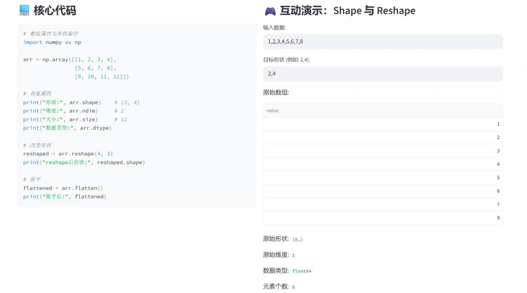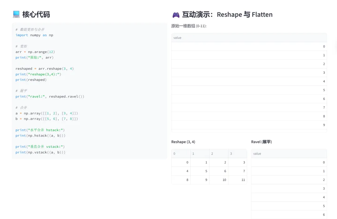(6)数组变形(reshape、ravel)和数组合并(hstack、vstack):该模块专门讲解NumPy数组的形状变换(reshape、ravel)和数组合并(hstack、vstack),通过交互式演示让学习者直观理解如何改变数组结构以及如何将多个数组组合起来。