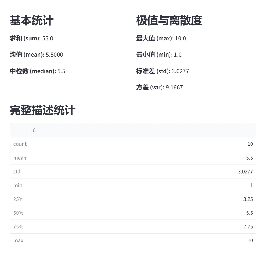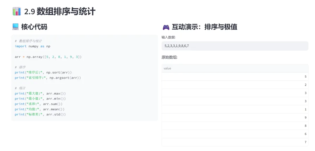 (7)排序与统计(sum、mean、std、max/min):该模块专门讲解NumPy数组的排序方法和统计函数,包括sort()排序、argsort()索引排序,以及sum()、mean()、std()、max()、min()等统计运算。通过交互式数据输入,让学习者直观理解各种统计函数的作用。