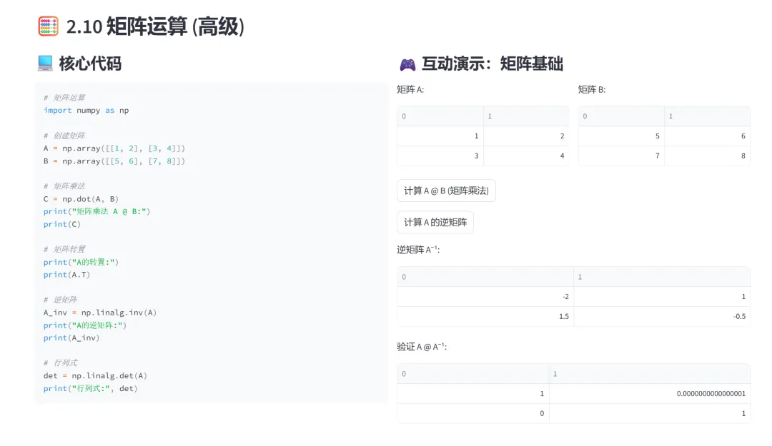(8)矩阵运算(点积、转置、逆矩阵、行列式):该模块专门讲解NumPy中的线性代数运算,包括矩阵乘法(点积)、矩阵转置、逆矩阵和行列式计算。通过交互式按钮演示,让学习者直观理解矩阵运算的基本概念和操作方法。