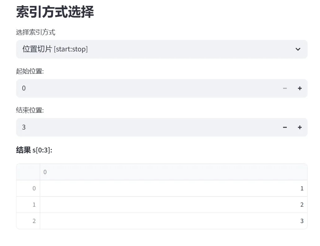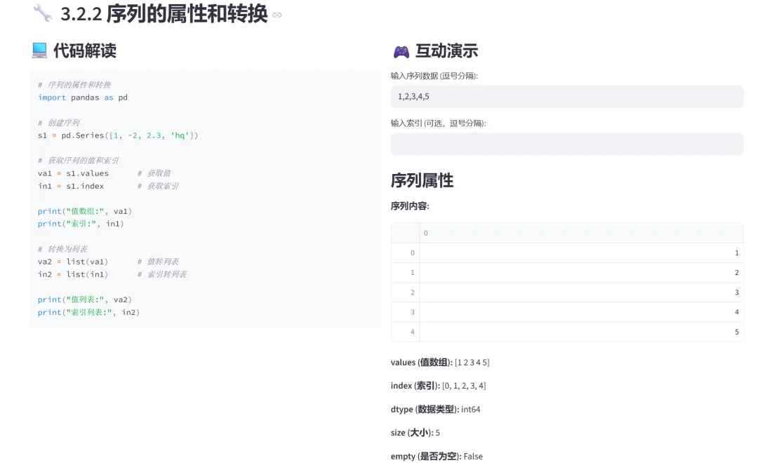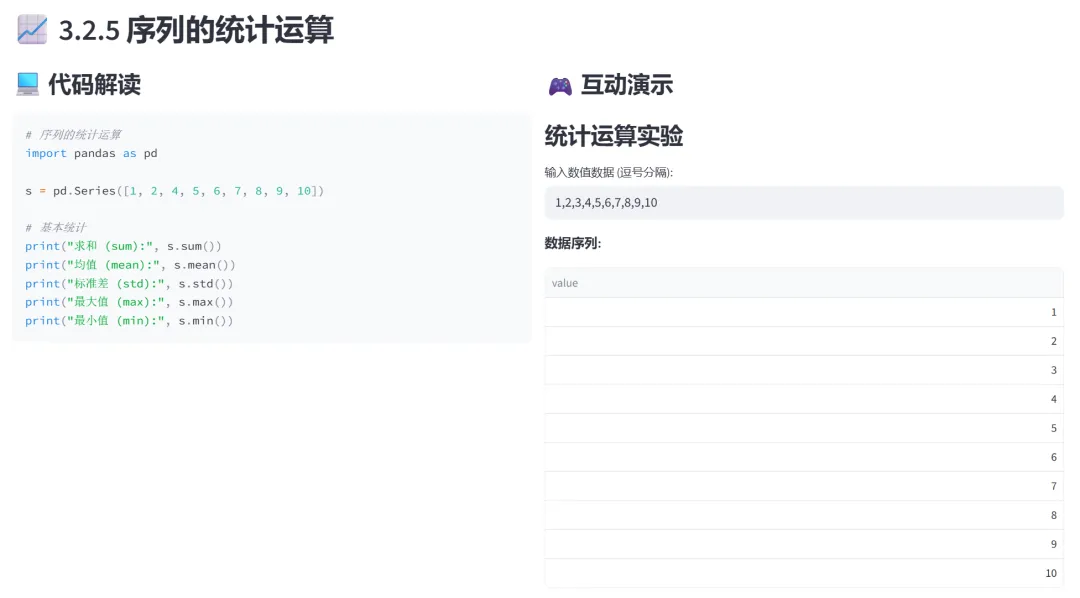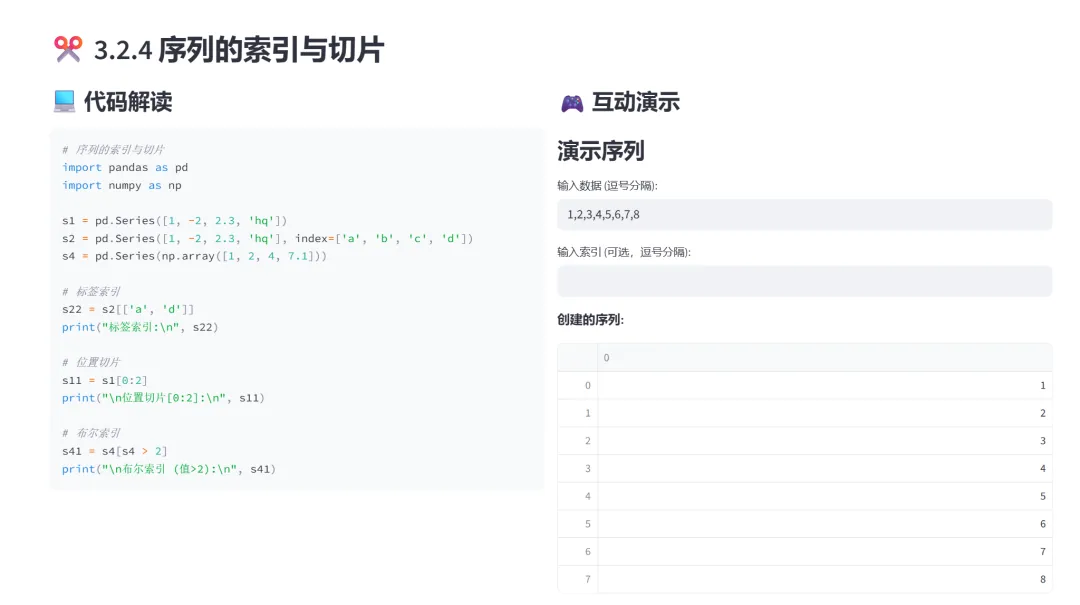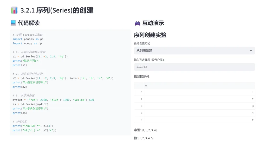 (1)Series的创建(列表、字典、指定索引):该模块专门讲解Pandas Series的三种创建方式:从列表创建、从字典创建、指定索引创建。通过交互式选择器和实时预览,让学习者直观理解Series的核心概念和创建方法。