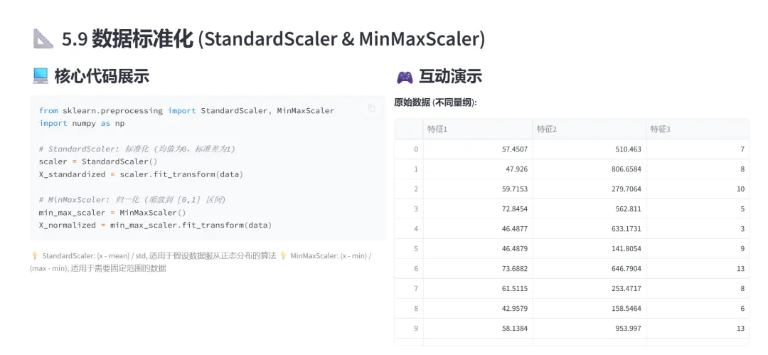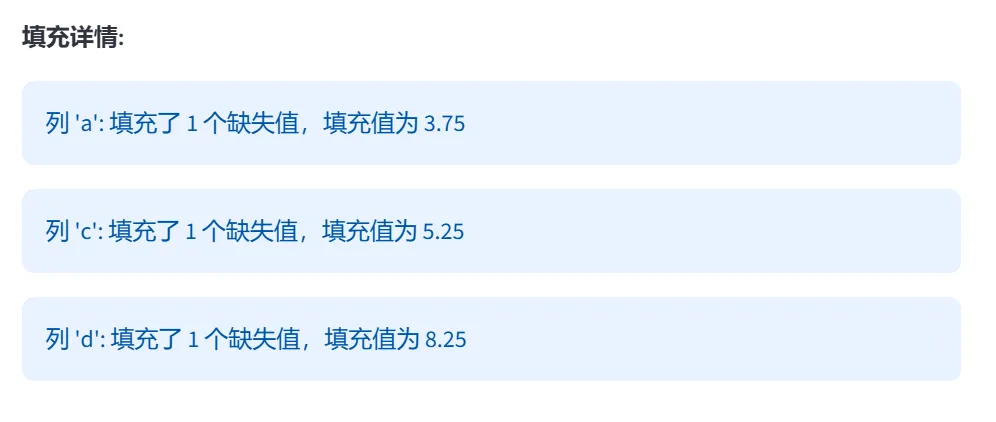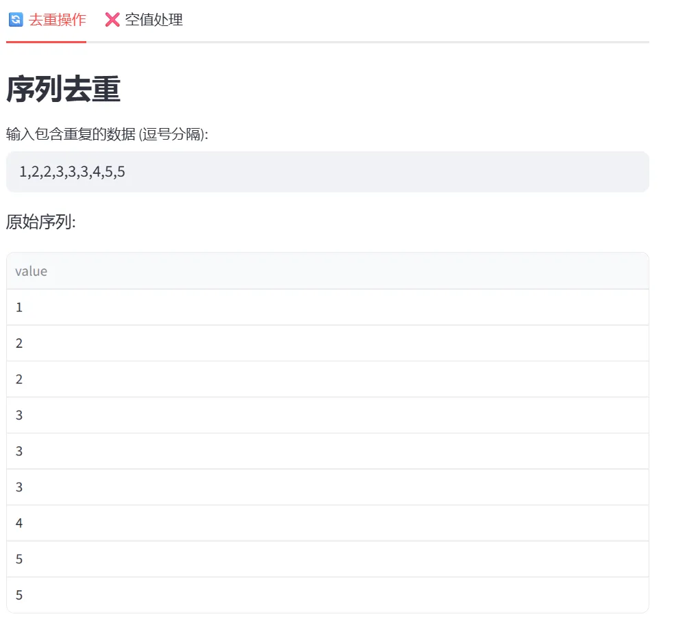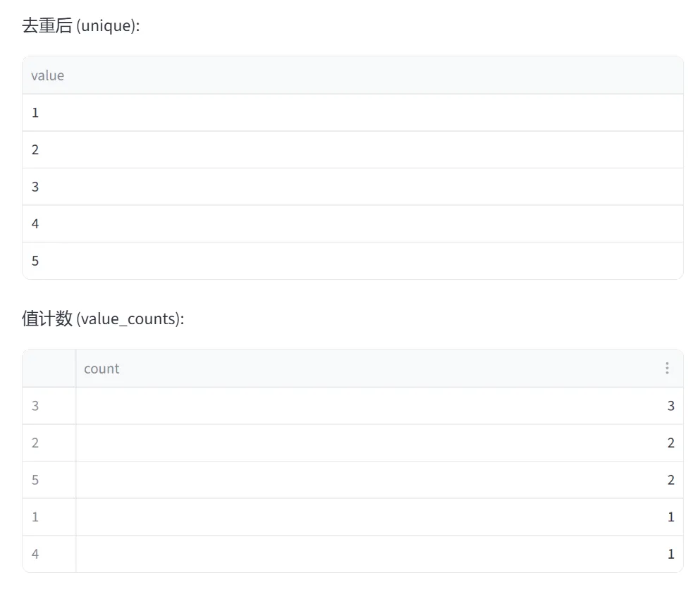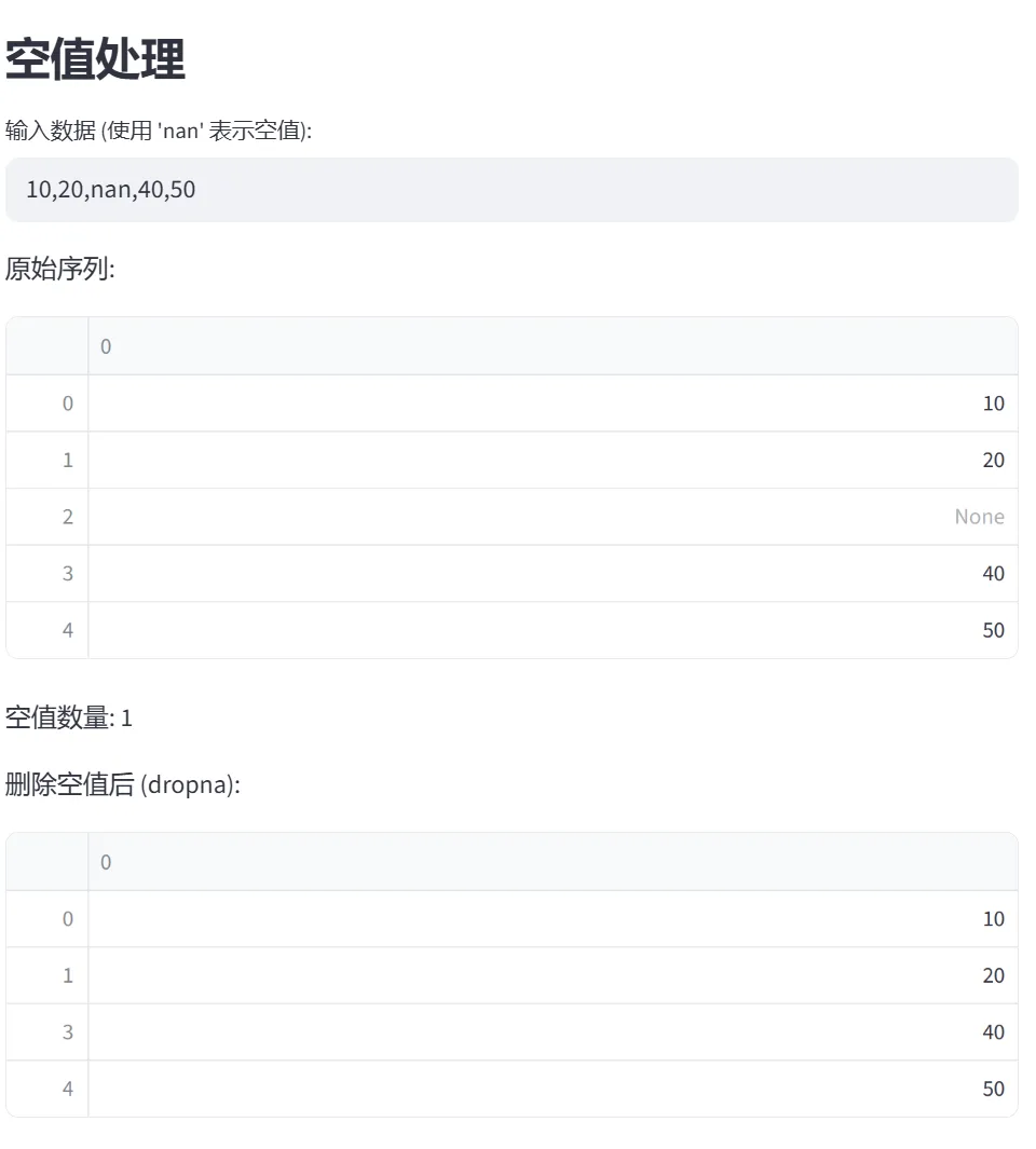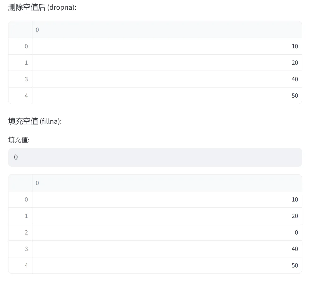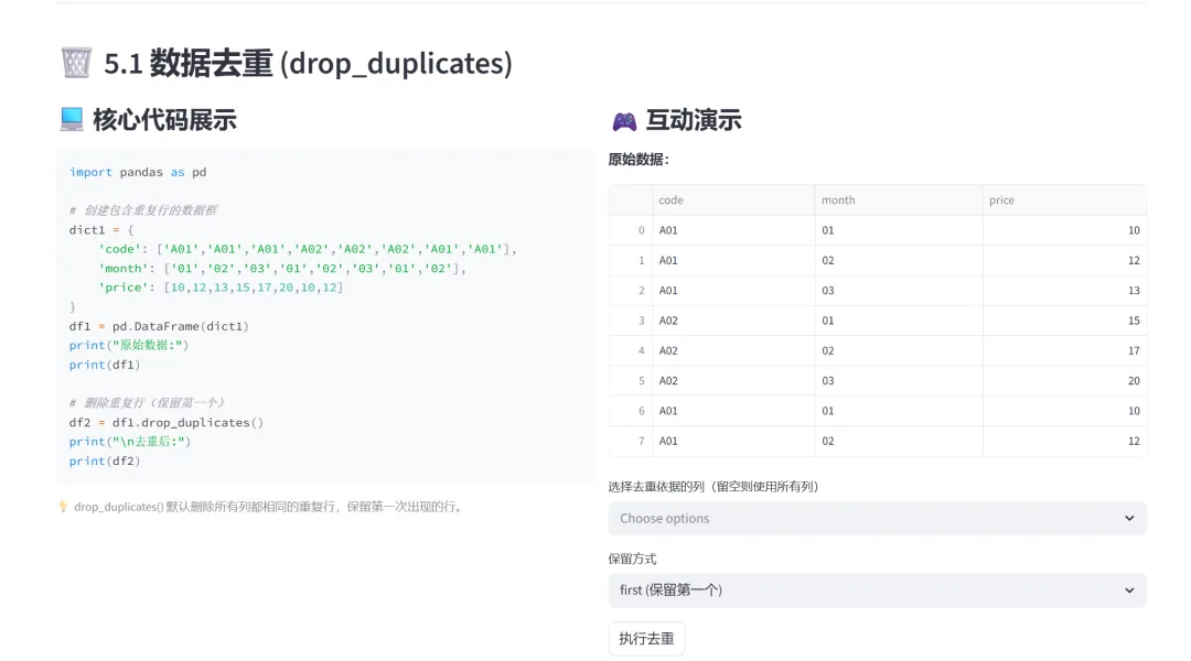 (3)去重与空值处理(unique、dropna、fillna):本模块通过两个选项卡分别演示数据清洗中最常用的两个操作:去重和空值处理。这是数据预处理的核心内容。