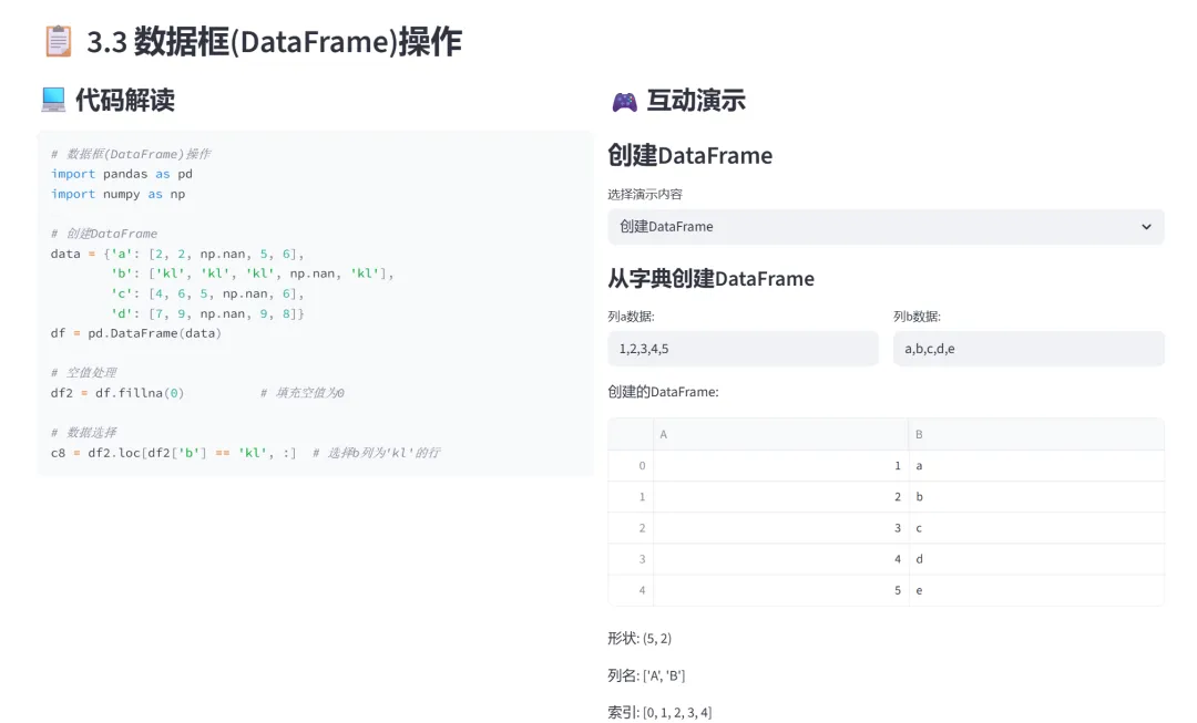 (6)DataFrame操作(创建、空值处理、数据选择、排序):本模块是DataFrame的综合演示,通过四个选项卡分别展示DataFrame的创建、空值处理、数据选择和排序操作。DataFrame是Pandas最核心的二维数据结构。