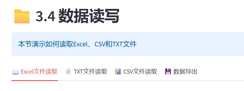 (7)数据读写(Excel、CSV、TXT):本模块演示Pandas读取和写入各种文件格式的能力,是连接外部数据的桥梁