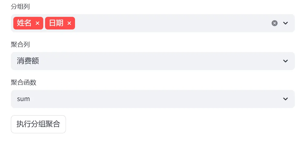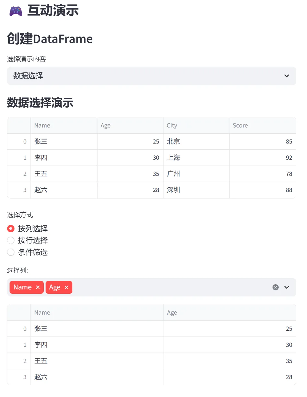 在数据选择模块中,系统内置了一个示例DataFrame(姓名、年龄、城市、分数),你可以通过下拉菜单选择: