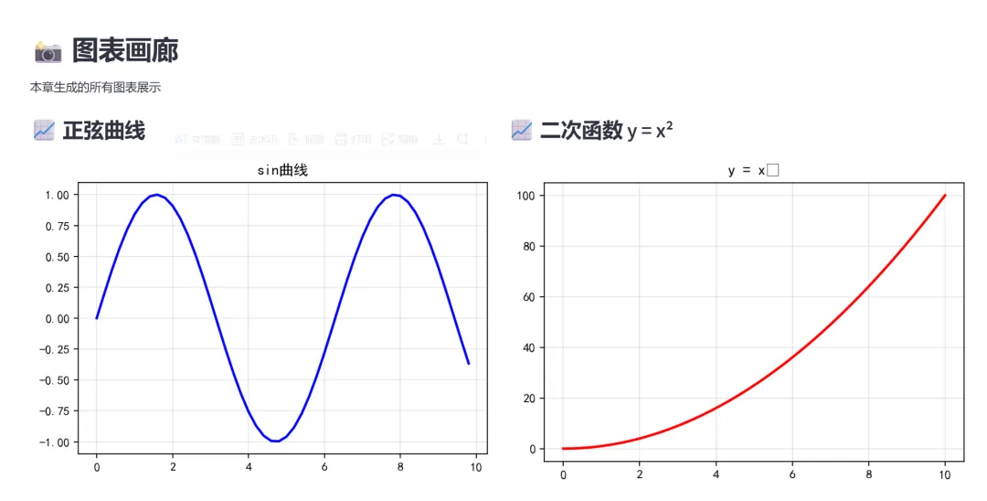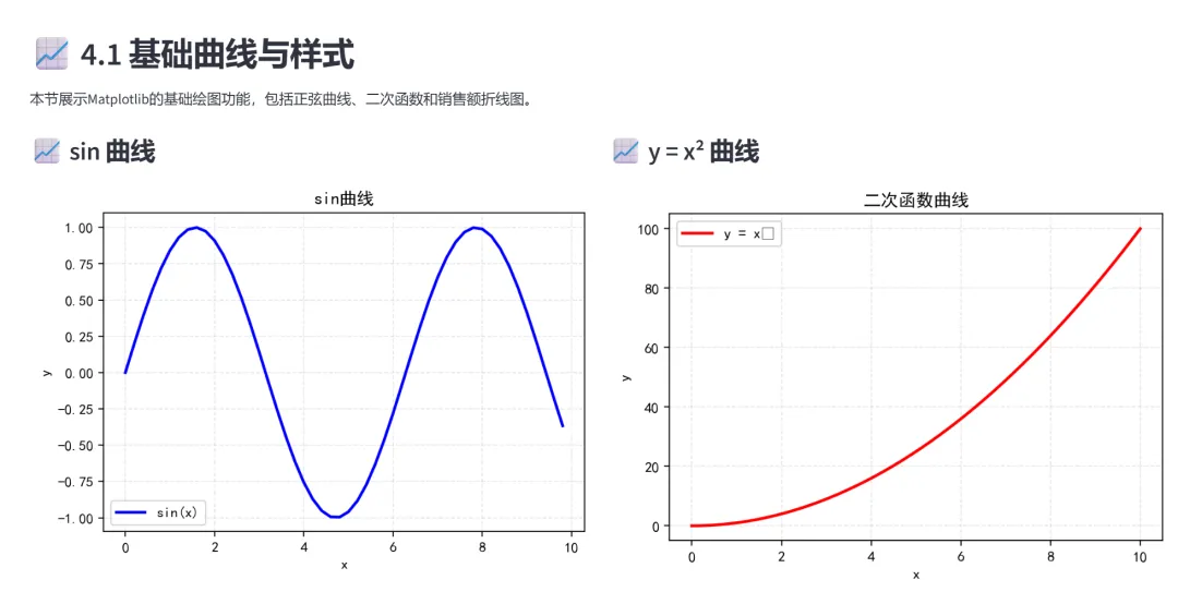(1)基础图表(正弦曲线、二次函数、季度销售额):本模块是可视化的入门篇章,通过三个经典的基础图表,帮助学习者理解Matplotlib的基本绘图流程,包括:创建画布、绘制曲线、设置标签和标题、添加图例、显示网格等核心操作。