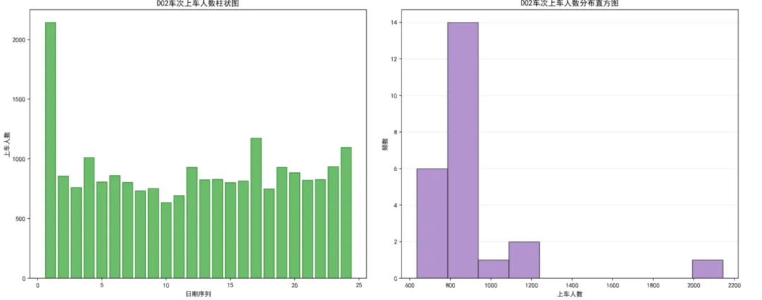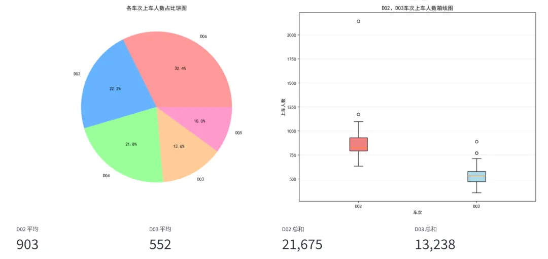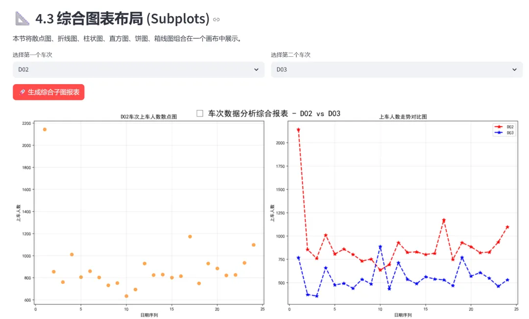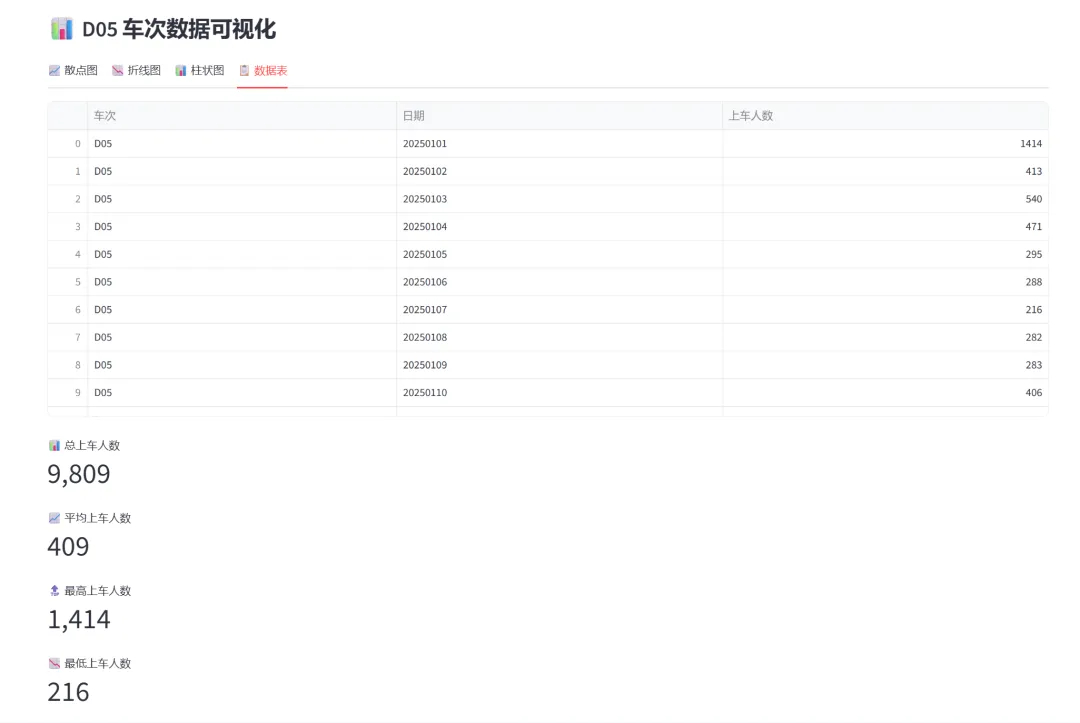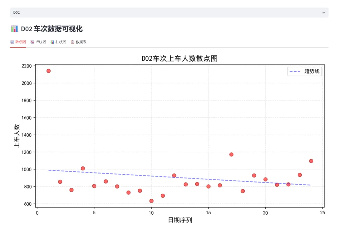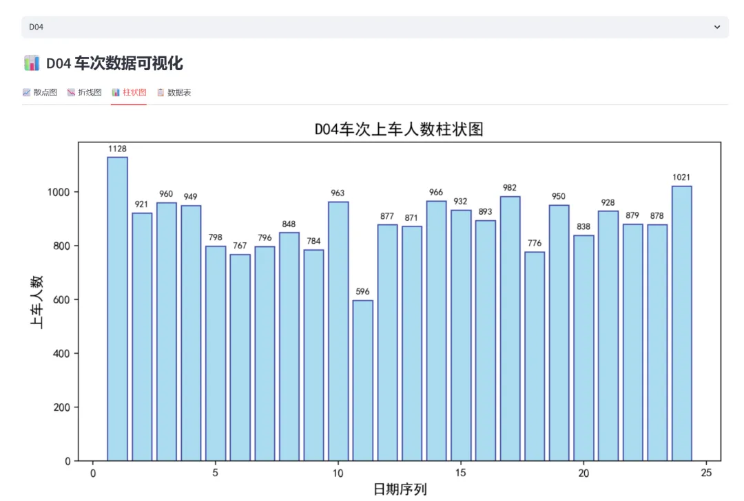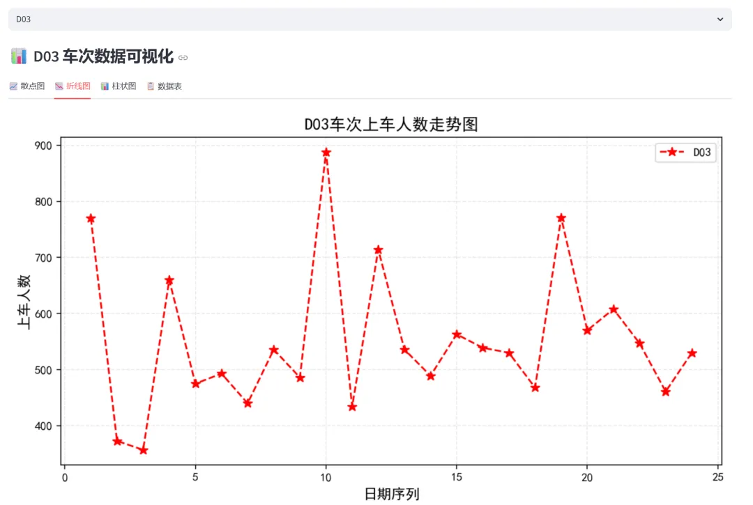(2)车次数据可视化(散点图、折线图、柱状图、数据表):本模块基于真实的列车上车人数统计数据(包含D02、D03、D04、D05、D06共5个车次,24天的数据),通过四种不同的可视化方式展示同一数据集,让学习者理解不同图表类型如何呈现数据的不同维度。