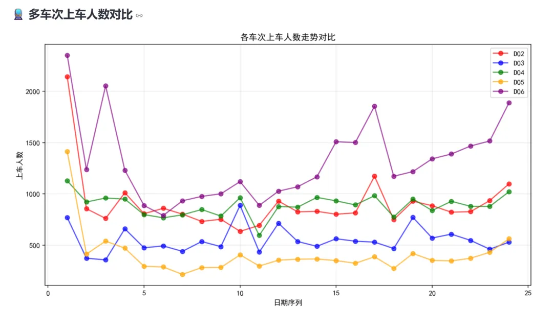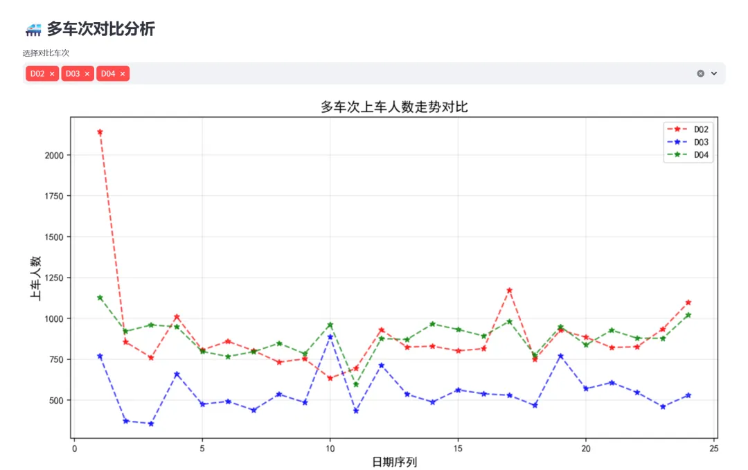 (3)多车次对比分析:用户可以通过多选框选择多个车次,系统在同一个坐标系中绘制各车次的上车人数走势,不同车次使用不同颜色的线条,适合对比不同线路的客流量差异