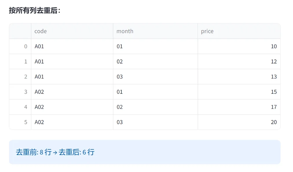 (1)数据去重(drop_duplicates):本模块演示Pandas中删除重复数据的方法。在数据采集和整合过程中,重复记录是常见问题,正确识别和删除重复项是数据清洗的第一步。
