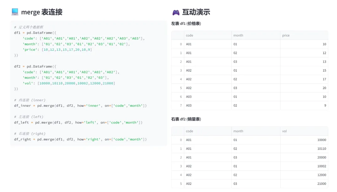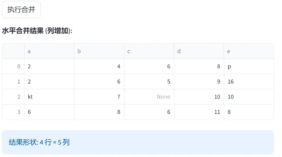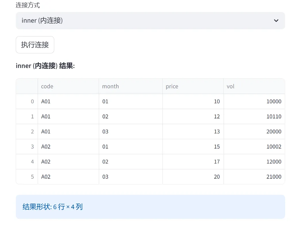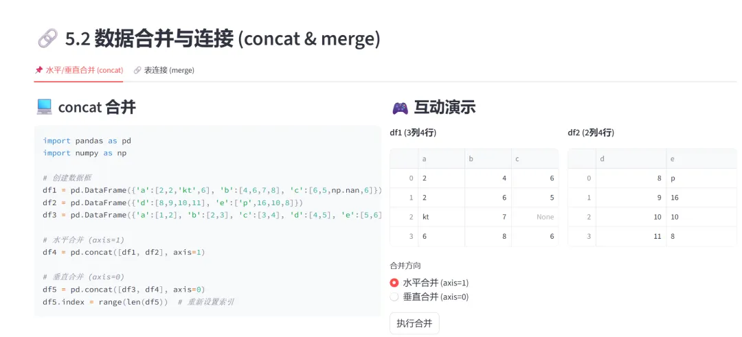 (2)数据合并与连接(concat、merge):本模块通过两个选项卡分别演示数据的横向/纵向合并(concat)和表连接(merge),解决多数据源整合的问题。
