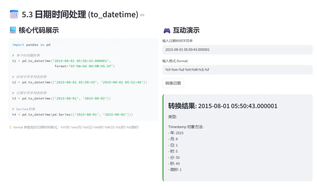 (3)日期时间处理(to_datetime、format):本模块演示Pandas中字符串与时间戳的转换方法,是时间序列分析的基础