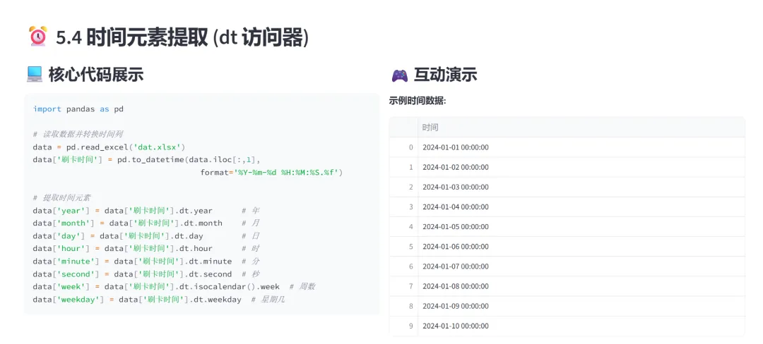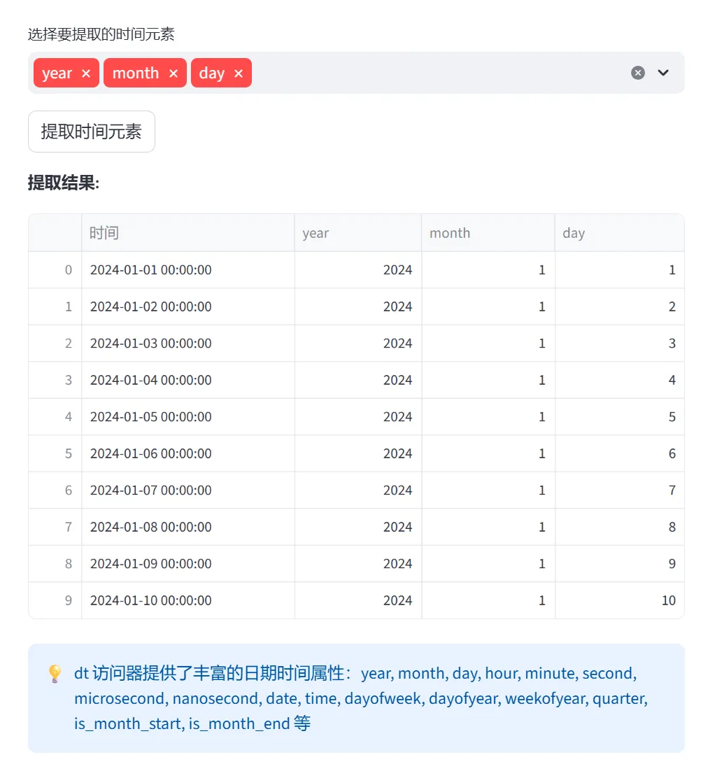 (4)时间元素提取(dt.year、dt.month、dt.weekday等):本模块演示如何使用dt访问器从时间序列中提取各种时间分量,是时间特征工程的核心技术