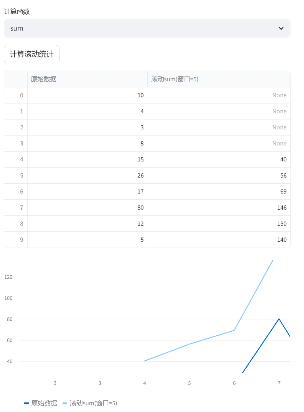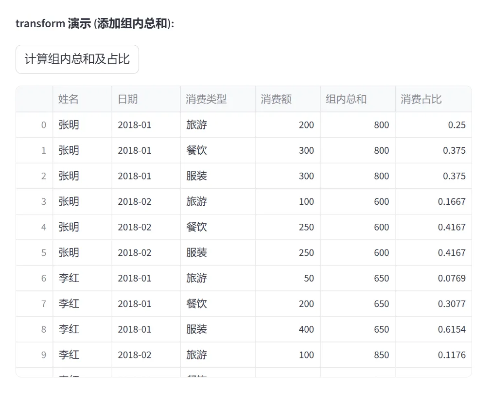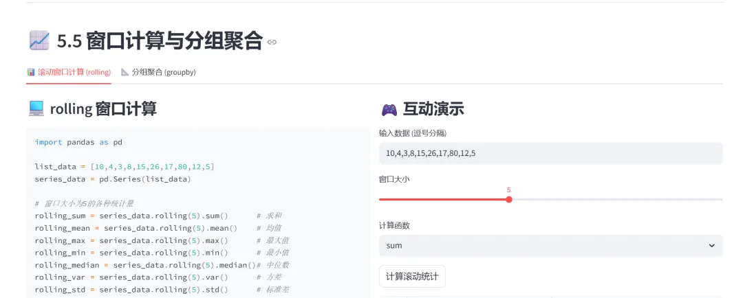 (5)窗口计算与分组聚合(rolling、groupby、transform):本模块通过两个选项卡分别演示滚动窗口计算和分组聚合操作,是数据分析和特征工程的重要工具。
