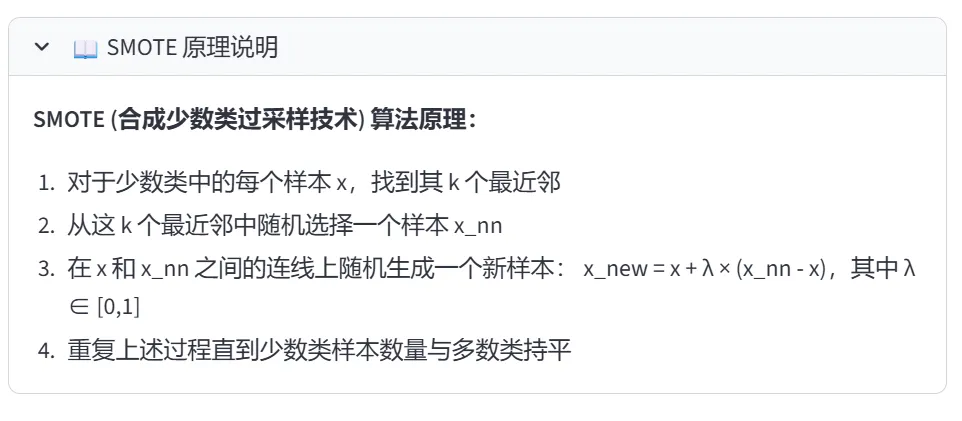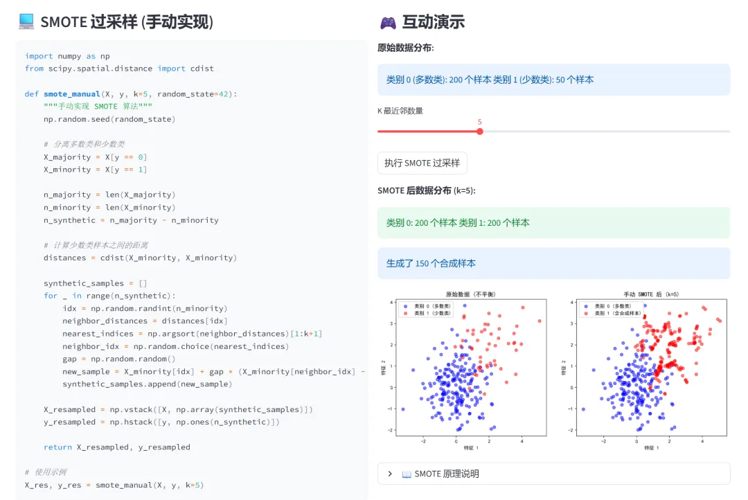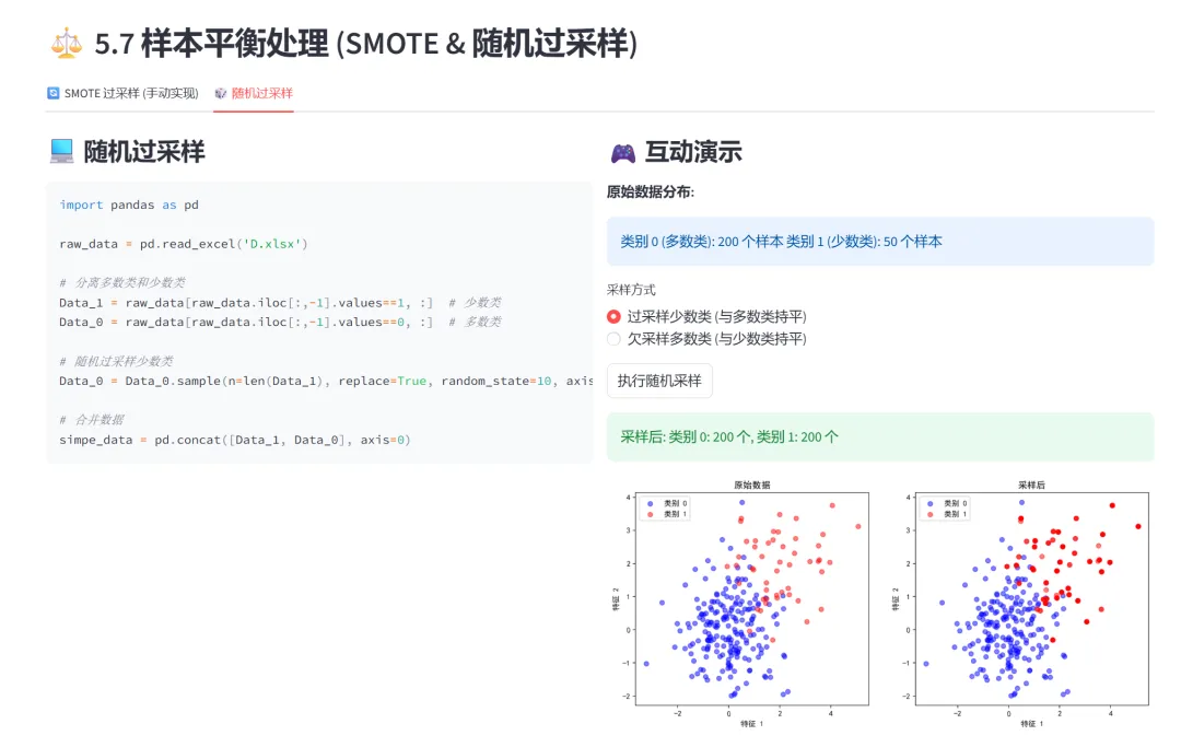 (6)样本平衡处理(SMOTE手动实现、随机过采样):本模块通过两个选项卡分别演示SMOTE过采样和随机采样,解决分类问题中的样本不平衡问题。