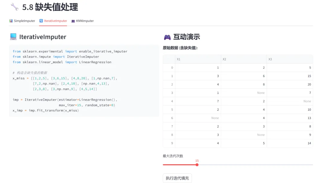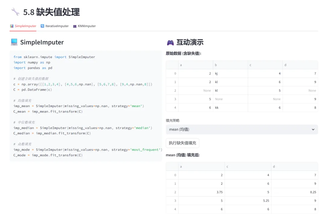 模块中还增添原理介绍,让学习者更好了解运行原理,更直观看到运用效果(7)缺失值处理(SimpleImputer、IterativeImputer、KNNImputer):本模块通过三个选项卡分别演示三种缺失值填充方法,从简单统计填充到复杂的机器学习预测填充。