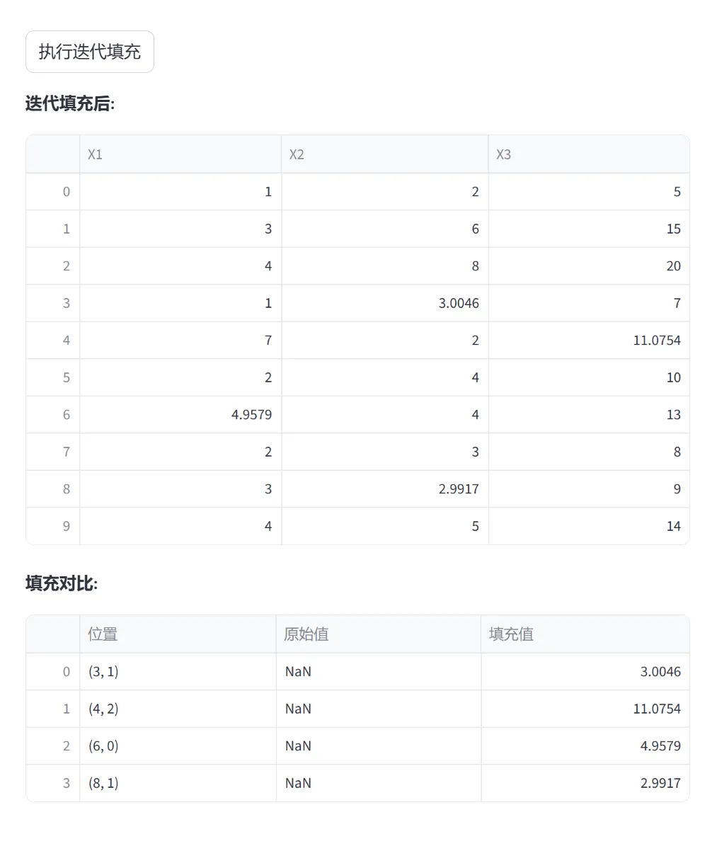 原理:将每个含缺失值的特征视为预测目标,用其他特征(含已填充值)作为输入建立回归模型(默认BayesianRidge)。