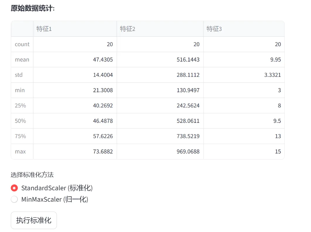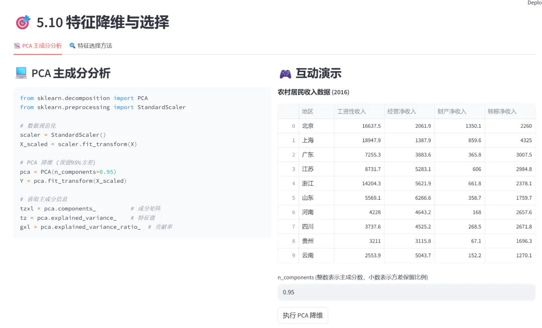 (9)特征降维与选择(PCA、方差阈值、卡方检验、F检验、互信息、随机森林特征重要性):本模块通过两个选项卡分别演示PCA降维和多种特征选择方法,解决高维数据的维度灾难问题