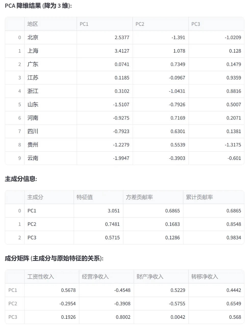 以农村居民收入数据为例,展示PCA如何将多维特征降维,并输出特征值、方差贡献率、累计贡献率和成分矩阵。
