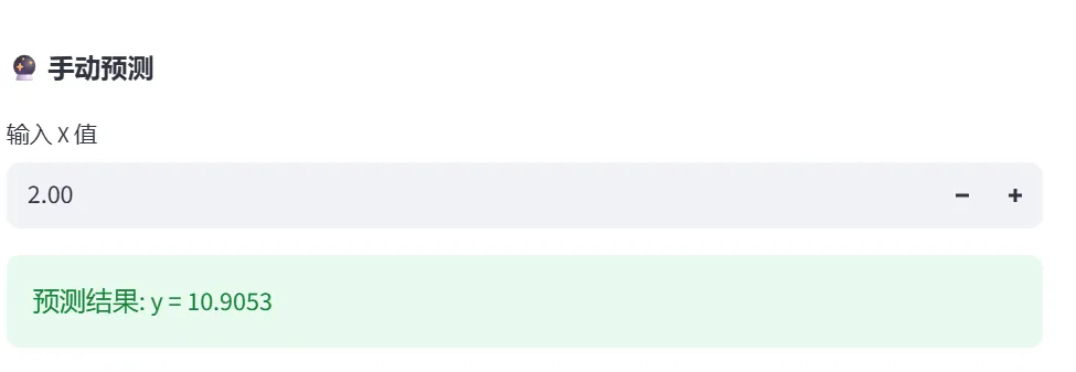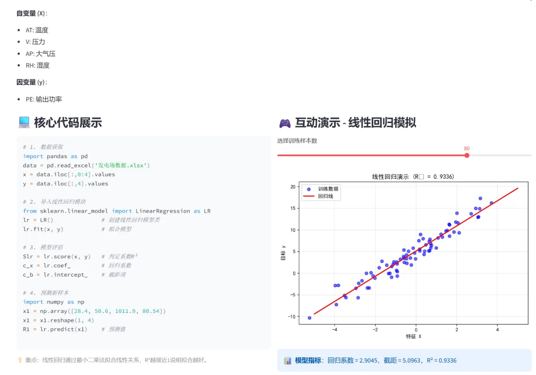 使用模拟数据展示回归线拟合过程,可调整训练样本数量,观察R²变化。支持手动输入X值进行预测。