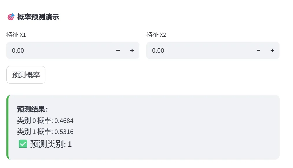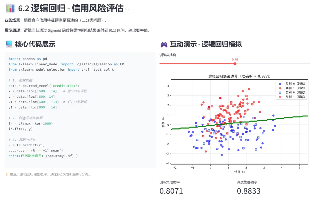 可视化决策边界,展示Sigmoid函数的概率输出。可调整训练集比例,对比训练/测试准确率。