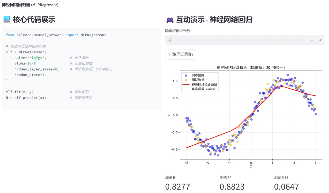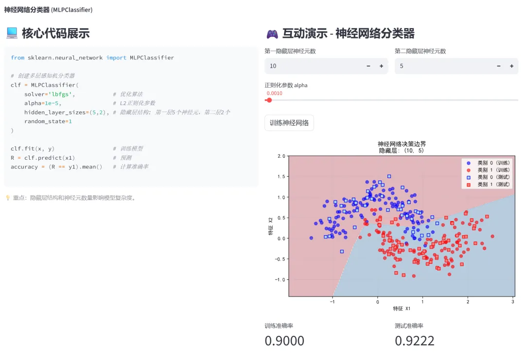 (3)神经网络(MLPClassifier、MLPRegressor):本模块通过两个选项卡分别演示神经网络在分类和回归任务中的应用。神经网络通过多层神经元的堆叠,能够学习复杂的非线性关系。