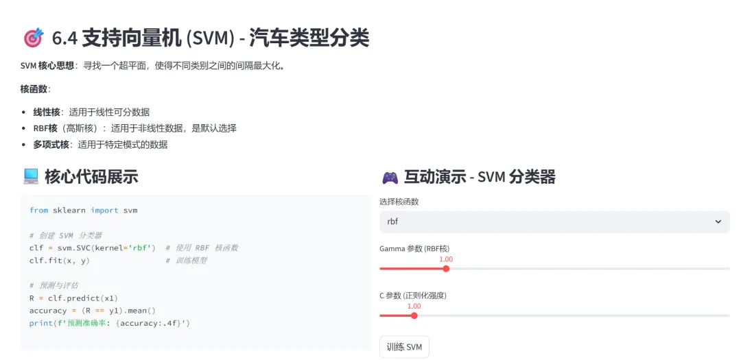 (4)支持向量机(SVM,汽车类型分类):本模块演示支持向量机算法在分类任务中的应用。SVM通过寻找最大化类别间隔的超平面来实现分类,是最经典的机器学习算法之一。