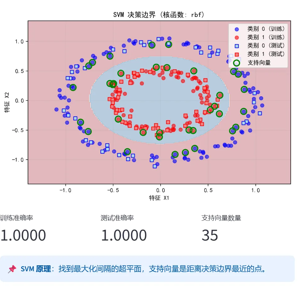 使用make_circles数据集(非线性可分),对比rbf、linear、poly三种核函数的效果。支持调整gamma和C参数(RBF核)或多项式次数(poly核),并高亮显示支持向量。
