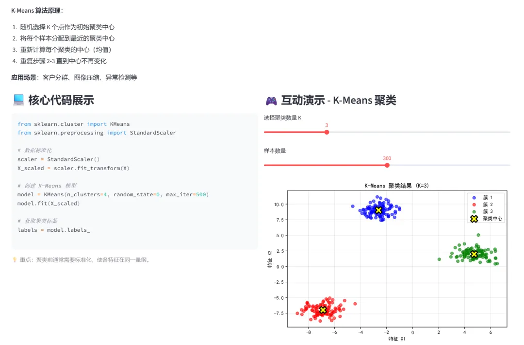 (5)K-Means聚类(客户分群):本模块演示K-Means聚类算法在无监督学习中的应用。聚类算法不需要标签,仅根据数据的相似性自动分组。
