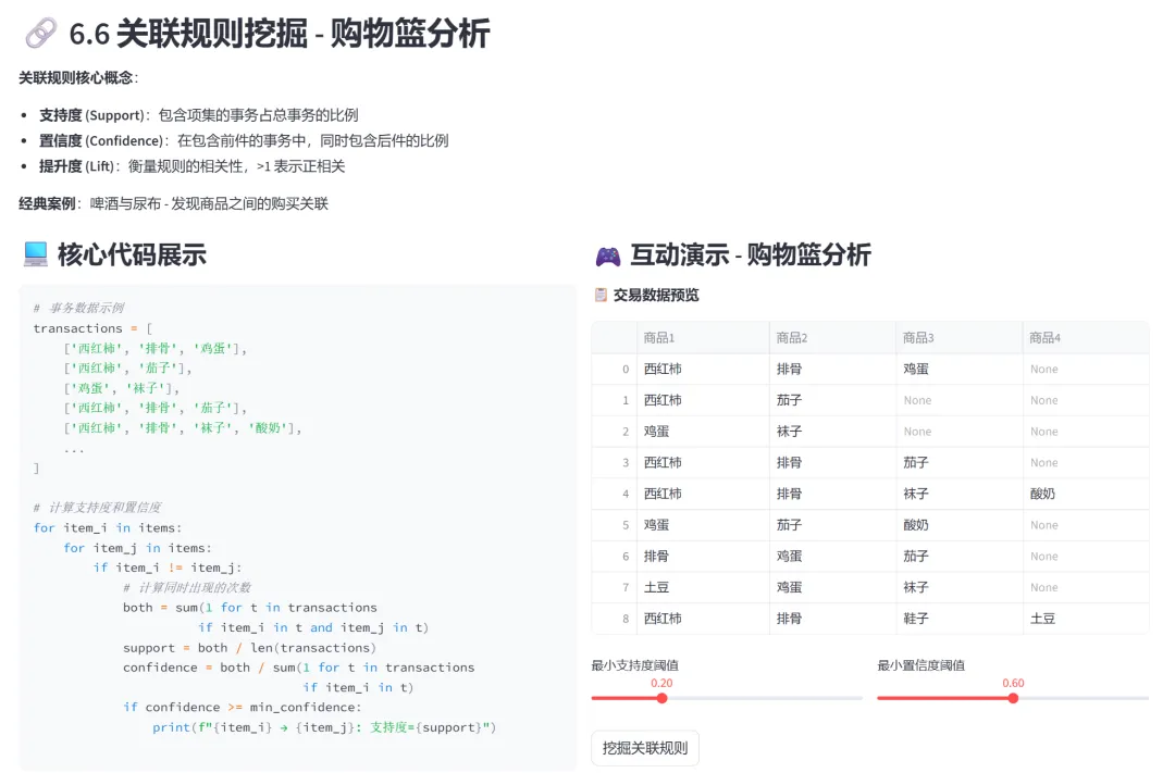 (6)关联规则挖掘(购物篮分析):本模块演示关联规则挖掘在购物篮分析中的应用。通过发现商品之间的购买关联,为商品推荐和货架布局提供决策支持。
