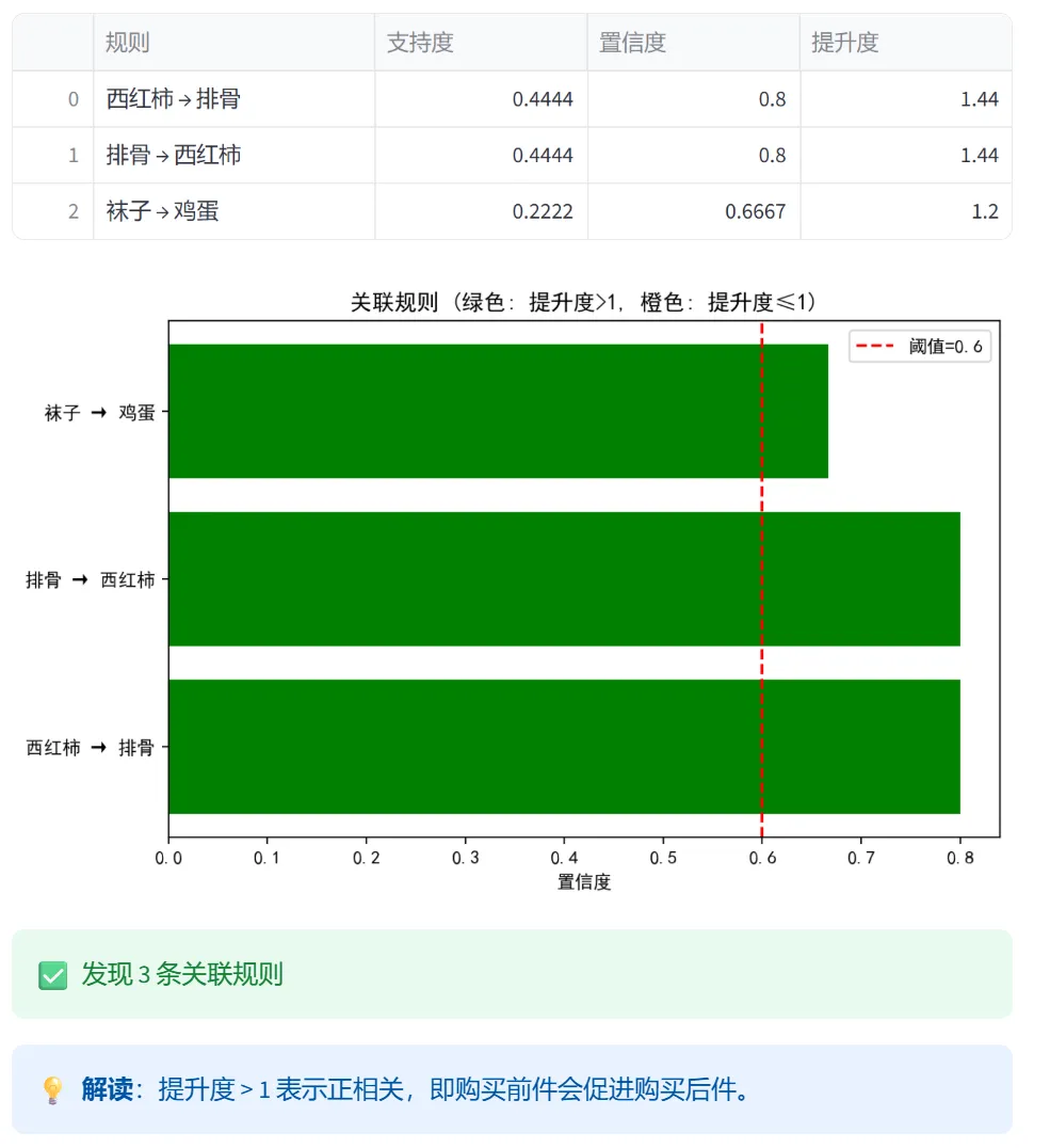 使用购物篮交易数据(西红柿、排骨、鸡蛋等商品),计算支持度、置信度和提升度。可调整最小支持度和置信度阈值,筛选有效规则。提升度>1表示正相关(如啤酒→尿布)。