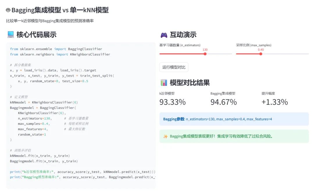 (1)Bagging算法(Bootstrap Aggregating):本模块通过两个子模块演示Bagging集成方法:第一部分通过交叉验证寻找k近邻模型的最优k值;第二部分对比单一kNN模型与Bagging集成模型的性能差异。
