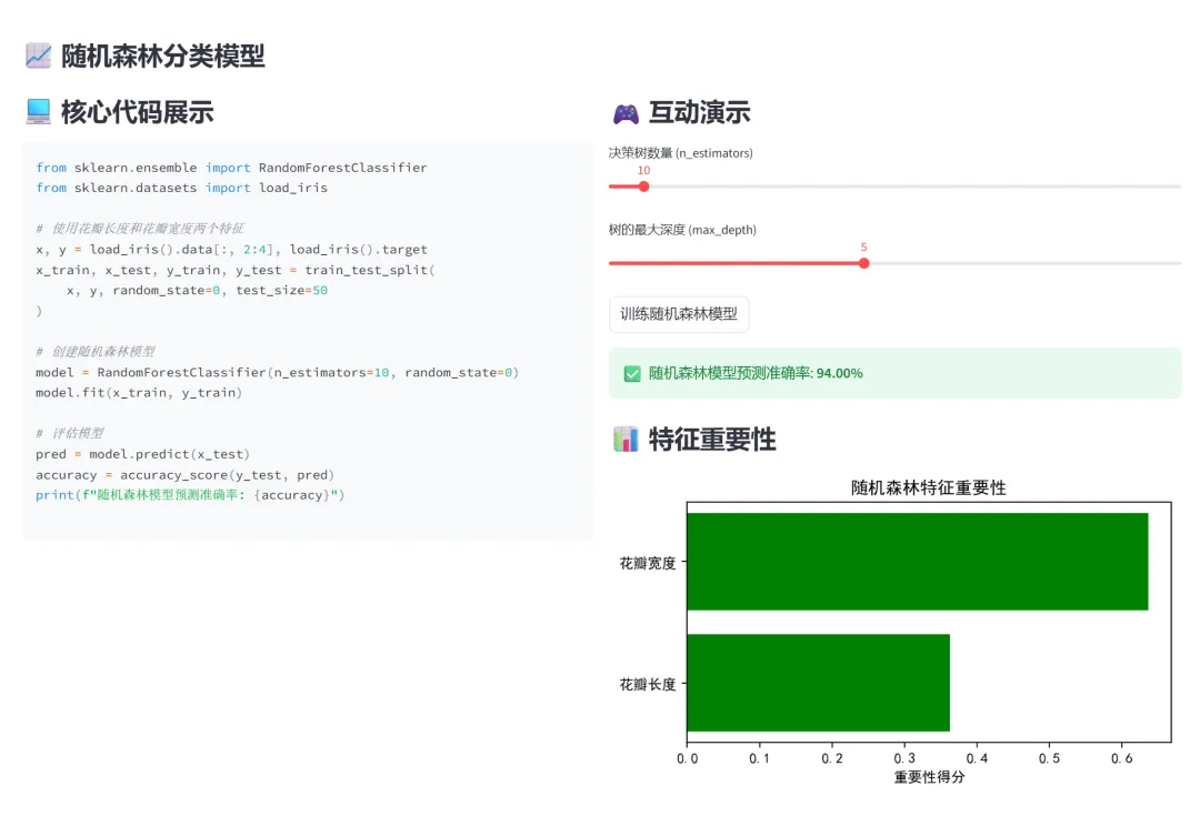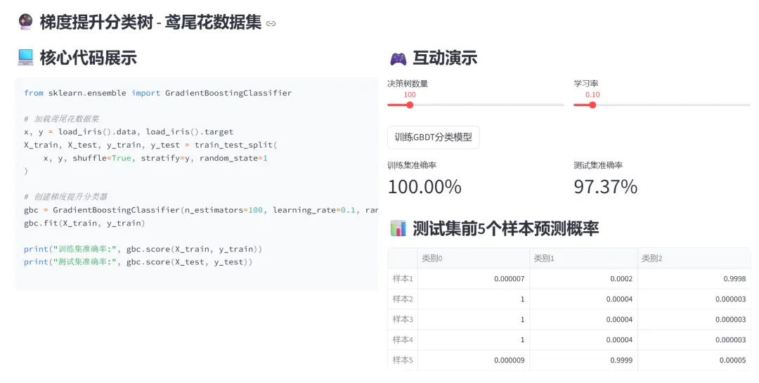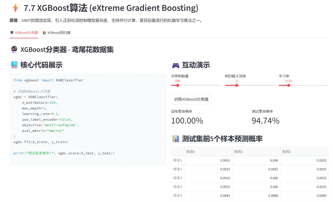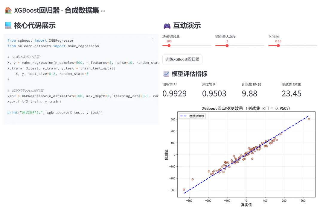 从Python基础语法到XGBoost集成学习,这个项目将七章教学内容浓缩进一个互动式网页中。它的价值不在于代码有多复杂,而在于降低了学习门槛——你不需要配置Jupyter、不用担心包冲突、不用复制粘贴代码等运行结果。打开网页,左边是代码,右边是演示,调整参数就能看到变化。