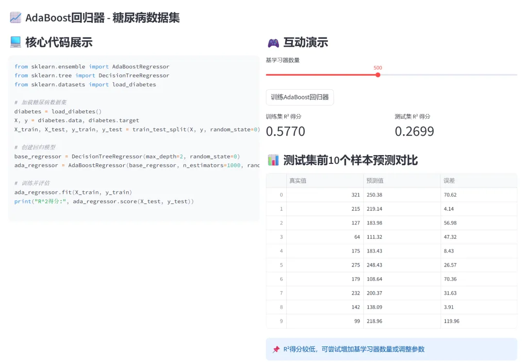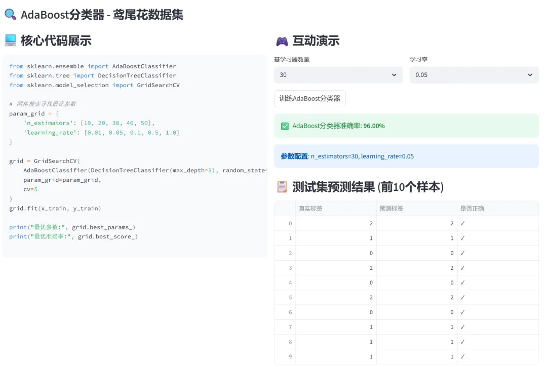 (3)AdaBoost(Adaptive Boosting):本模块通过两个子模块分别演示AdaBoost在分类和回归任务中的应用,并支持网格搜索寻找最优参数。