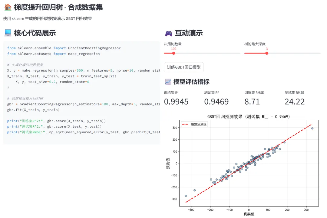 4. GBDT:回归任务:合成数据集(5个特征,500样本),展示R²和RMSE,绘制真实值vs预测值散点图