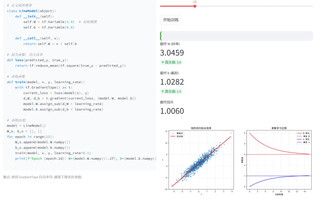 (1)线性回归预测:本模块演示使用TensorFlow的低级API(自定义训练循环)实现线性回归。这是理解深度学习框架底层工作原理的最佳入门示例,展示了梯度计算、参数更新等核心概念。