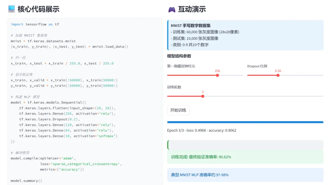 (2)MLP-MNIST手写识别:本模块使用多层感知机(MLP)对MNIST手写数字数据集进行分类。MNIST是深度学习的"Hello World",包含0-9共10个数字的28x28灰度图像。