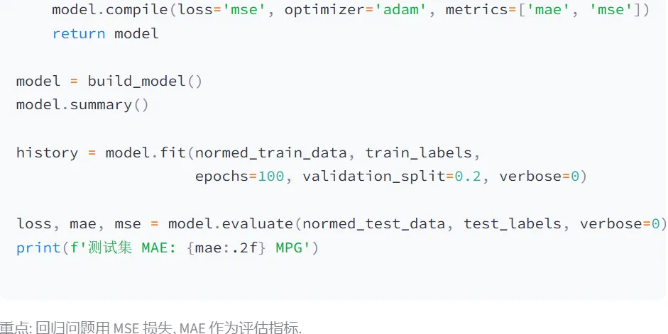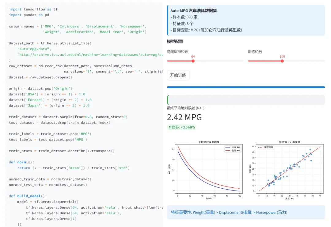 (3)MLP-MPG油耗预测:本模块使用MLP解决回归问题,预测汽车的燃油效率(MPG,每加仑汽油行驶英里数)。这是典型的数值预测任务,展示了深度学习在结构化数据上的应用。