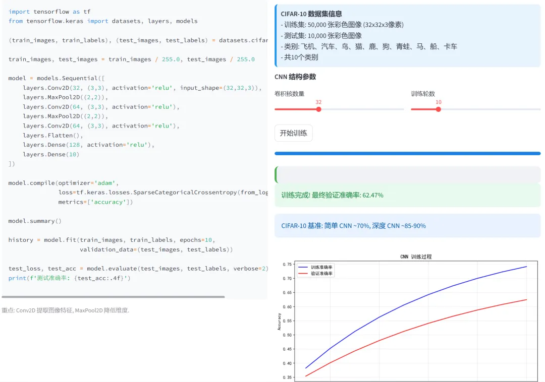 (4)CNN-Cifar10图像分类:本模块使用卷积神经网络(CNN)对CIFAR-10数据集进行图像分类。CIFAR-10是比MNIST更具挑战性的彩色图像数据集,展示了CNN在图像特征提取上的优势。