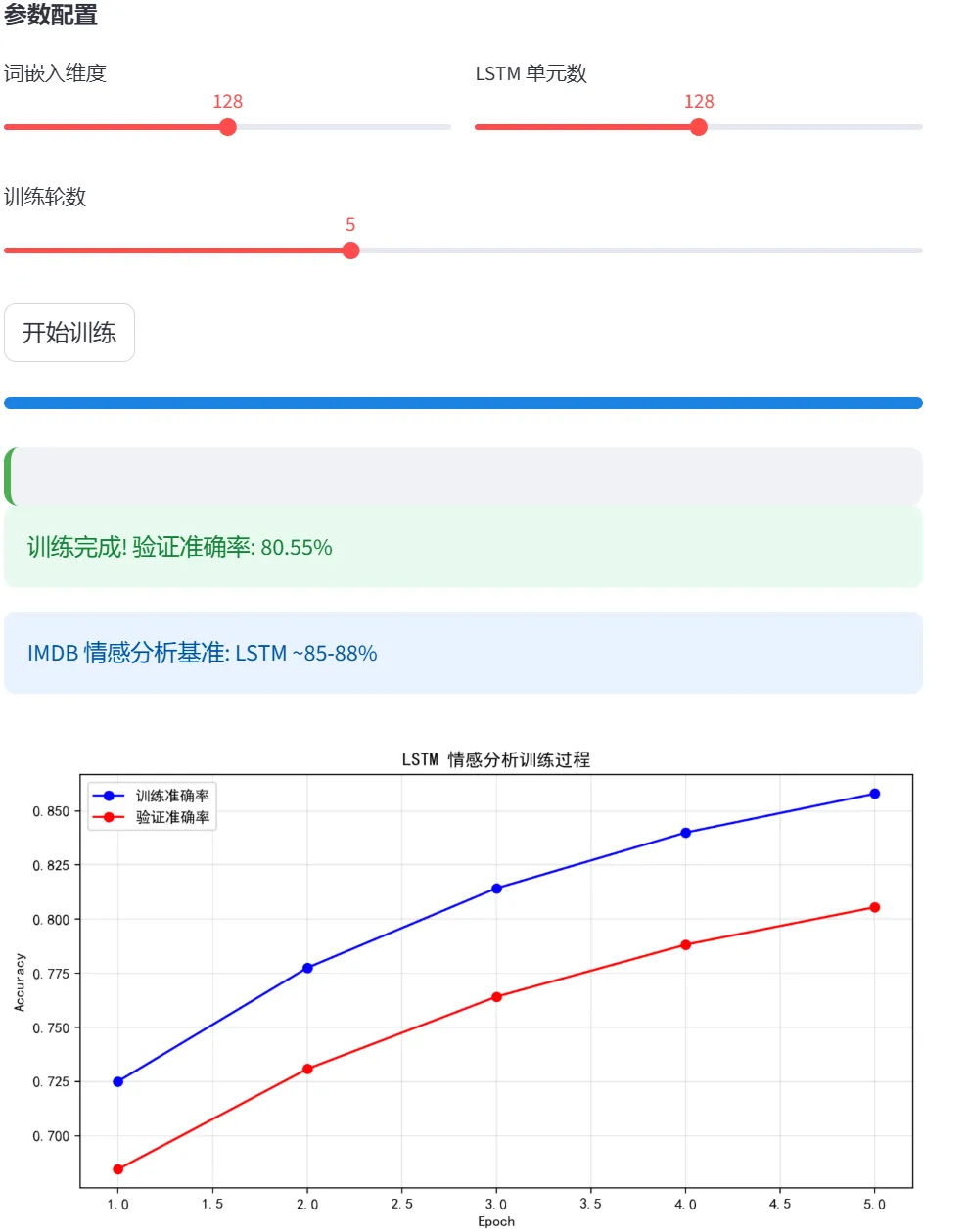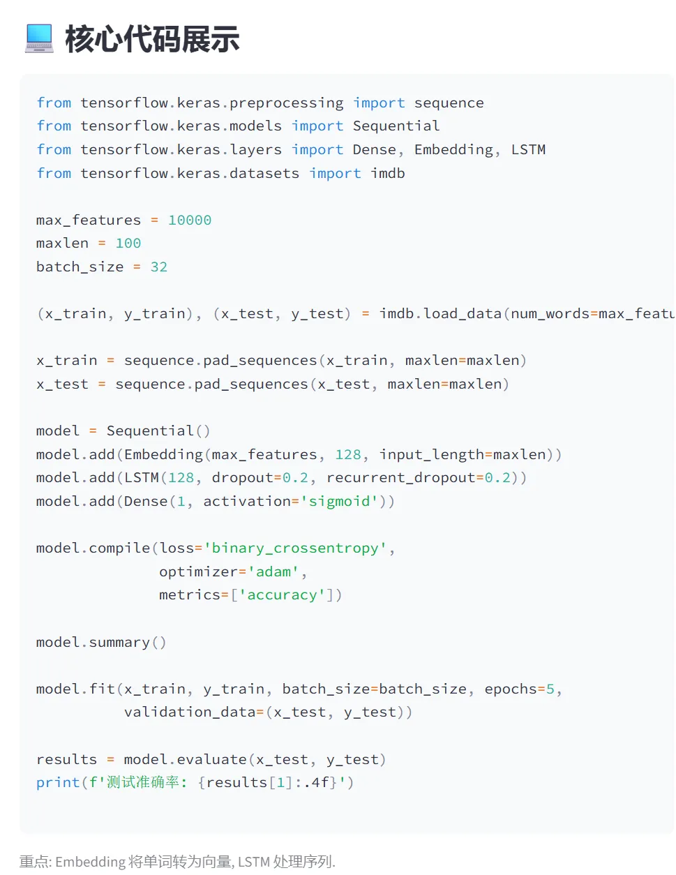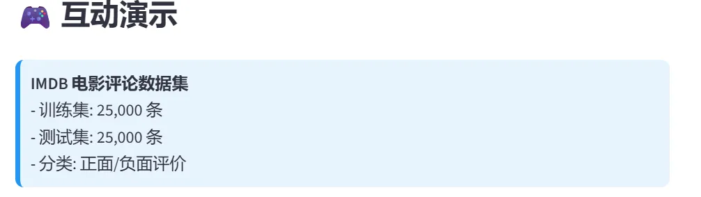 (5)RNN-IMDB情感分析:本模块使用LSTM(长短期记忆网络)对IMDB电影评论进行情感分析(二分类:正面/负面)。这是自然语言处理(NLP)的经典任务,展示了RNN处理序列数据的能力。