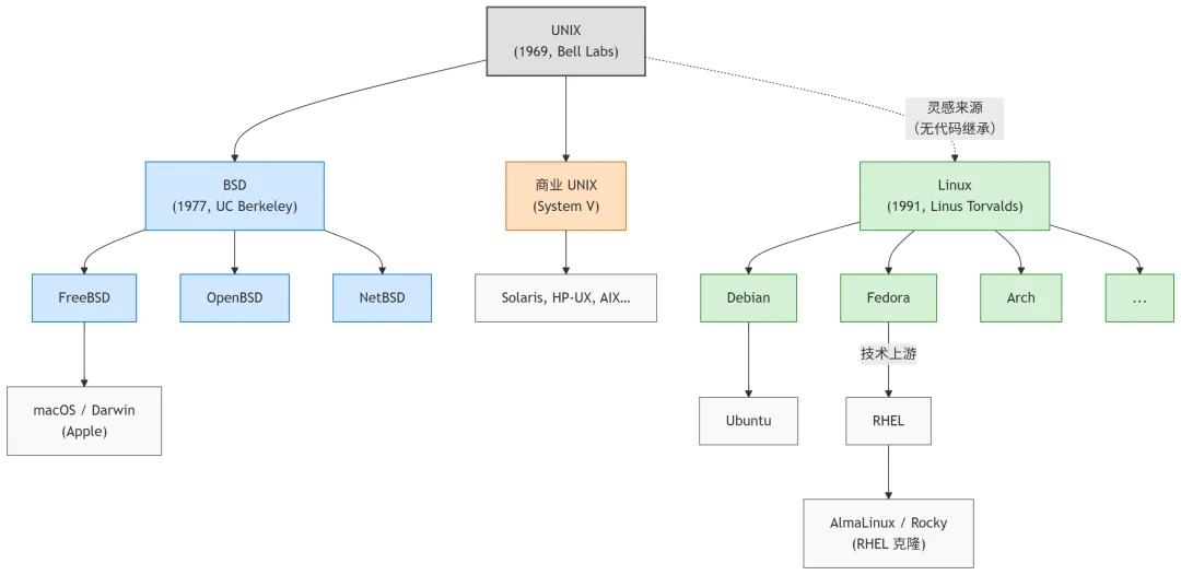 注意:Linux 和 BSD 没有直接的代码继承关系。Linux 是 Linus 从零写的内核,灵感来自 UNIX 的设计理念和 MINIX(Andrew Tanenbaum 写的教学用操作系统),但没有用 BSD 或 AT&T UNIX 的源代码。它们是"设计上的亲戚,代码上的陌生人"。