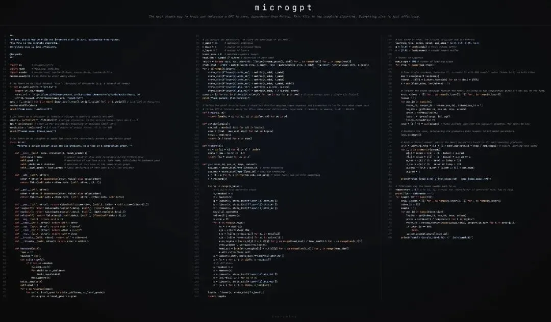 这是关于我的新艺术项目 microgpt 的简要指南——一个仅 200 行纯 Python 代码、无任何依赖项的文件,同时完成 GPT 的训练和推理。该文件包含了所需的全部算法内容:文档数据集、分词器、自动微分引擎、类 GPT-2 神经网络架构、Adam 优化器、训练循环和推理循环。其他一切不过是效率优化。我已经无法再简化了。