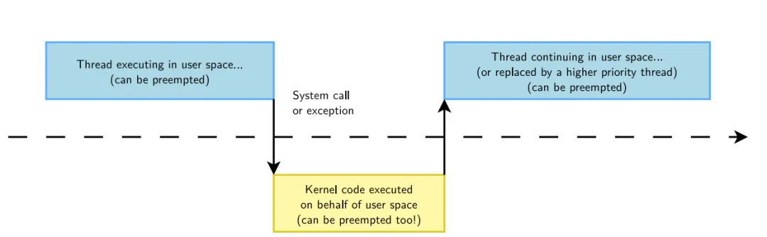 内核态抢占:配置CONFIG_PREEMPT时,内核态执行(除原子区外)可被高优先级线程抢占,降低系统延迟;