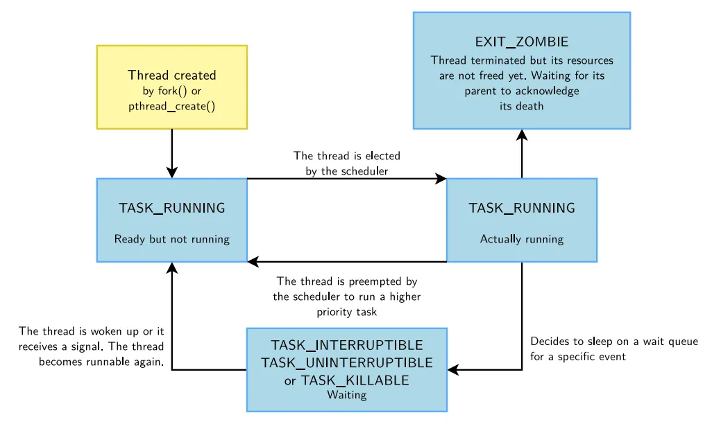创建态:通过fork()/pthread_create()创建,分配task_struct与资源,进入就绪队列;