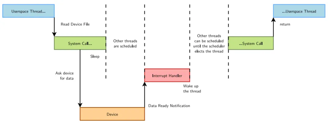 阻塞I/O实现:驱动读/写接口中,用等待队列让进程睡眠,硬件中断触发后唤醒进程,实现数据就绪同步;