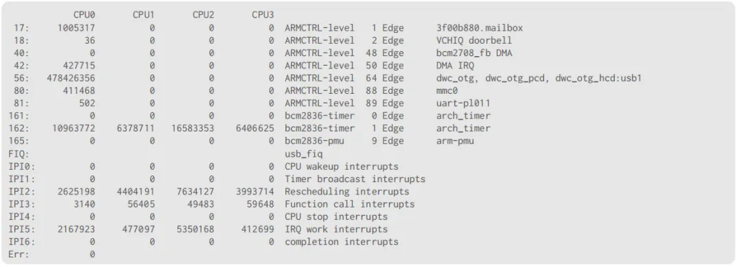 中断查看:调试期间可以通过cat /proc/interrupts查看系统中断统计,包含中断号、CPU触发次数、中断名称、设备信息,用于驱动调试。